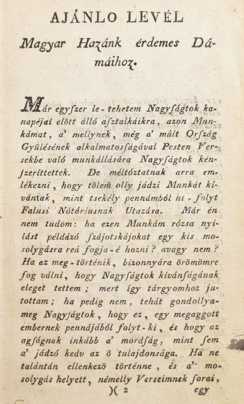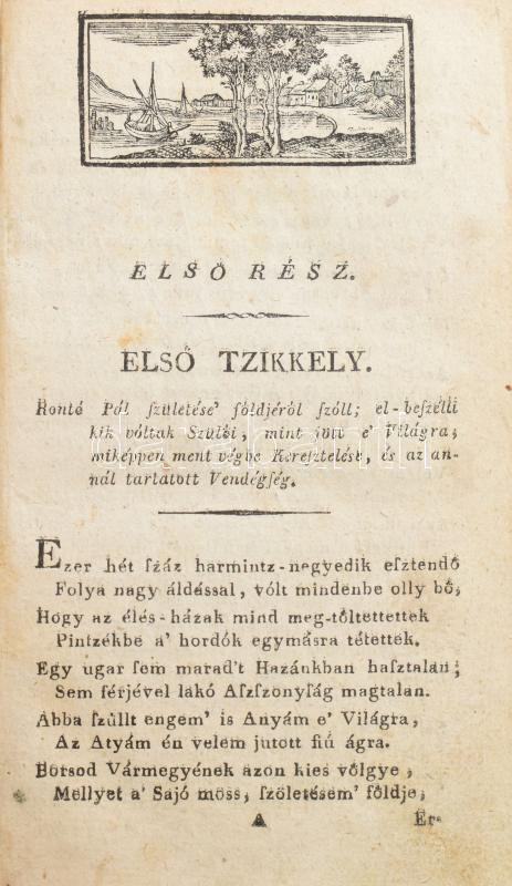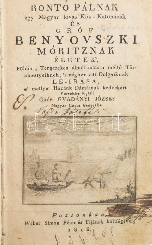 Gvadányi József: Rontó Pálnak, egy magyar lovas köz-katonának és gróf Benyovszki Móritznak életek Földön, Tengereken álmélkodásra méltó Történettyeiknek, s véghez vitt Dolgaiknak le-írása, a mellyet hazánk dámáinak kedvekért versekbe foglalt -- magyar lovas generális. Pozsony, 1816, Wéber Simon Péter és Fia, XX+548 p. [Harmadik kiadás.] A címlapon rézmetszetű vignettával. Korabeli aranyozott gerincű félbőr-kötés, kopott borítóval, kissé sérült gerinccel, javított kötéssel, a címlapon bejegyzésekkel, folttal, néhány lapon folttal, egy lap javított (97/98) a javításnál szöveget is érintő kisebb hiánnyal.