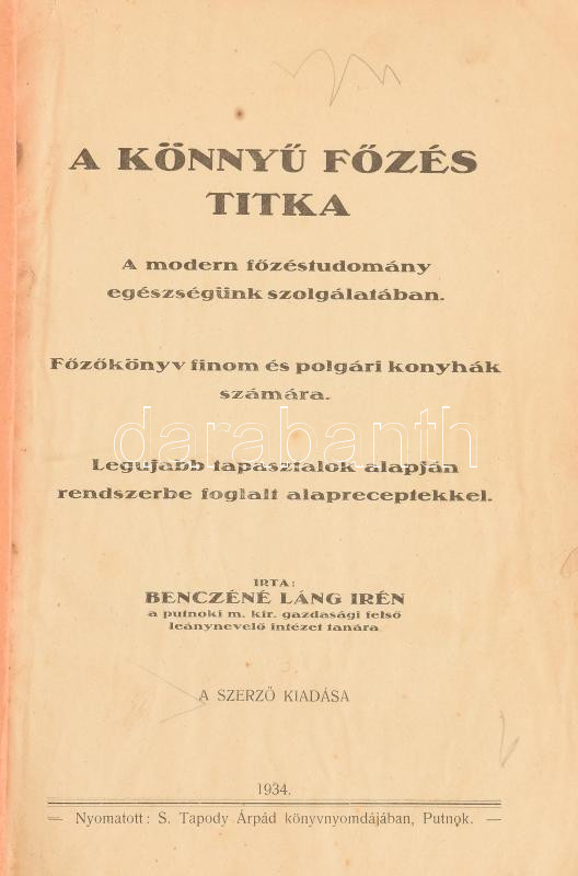 Benczéné Láng Irén: A könnyű főzés titka. A modern főzéstudomány egészségünk szolgálatában. Főzőkönyv finom és polgári konyha számára. Legujabb tapasztalatok alapján rendszerbe foglalt alapreceptekkel. Dr. Krajnik Mór által összeállított diétás étrendekkel. Dr. Czvetkovits Ferenc miniszteri tanácsos a Földmiv. Minisztérium gazd. szakoktatási osztályának vezetőjének előszavával. Szerzői kiadás. Putnok, 1934., S. Tapody Árpád-ny., 330 p. Átkötött félvászon-kötés, bekötött papírborítóval, kopott borítóval, a hátsó kötéstáblán sérülésnyommal, sérült kötéssel, néhány lap sarkán szamárfüllel, kissé foltos lapokkal, de közte 1-2 foltos lappal is, egy-két lapszéli szakadással, a szövegben egy-két javítással. Nagyon ritka, putnoki kiadású szakácskönyv.