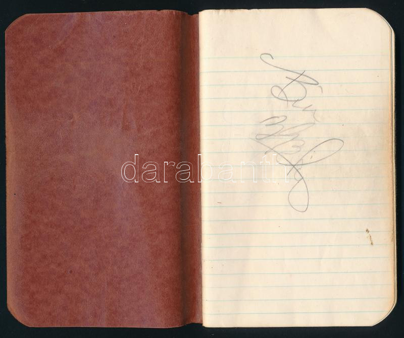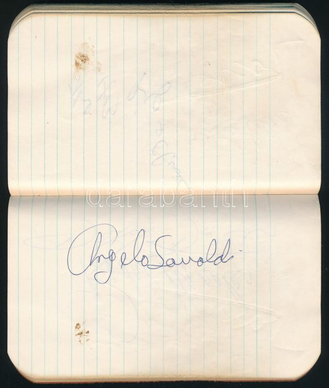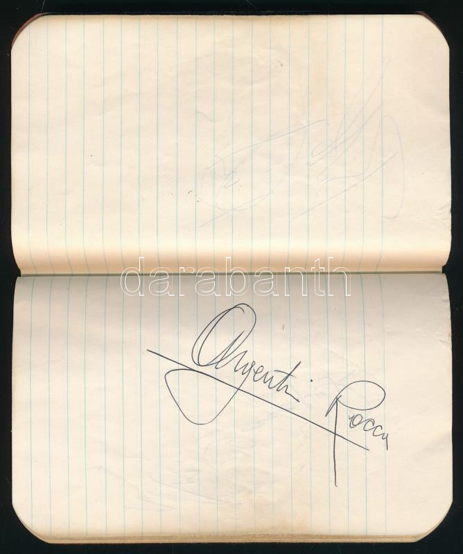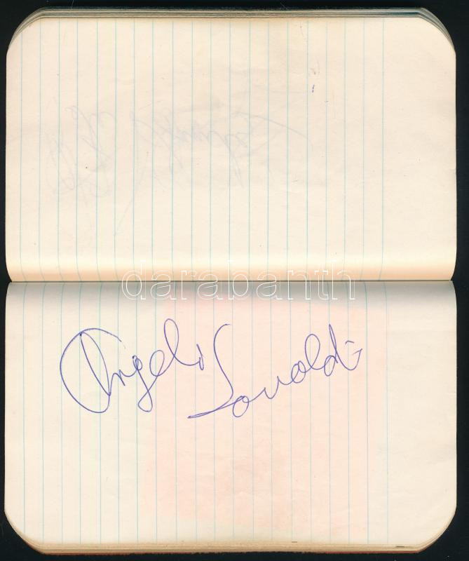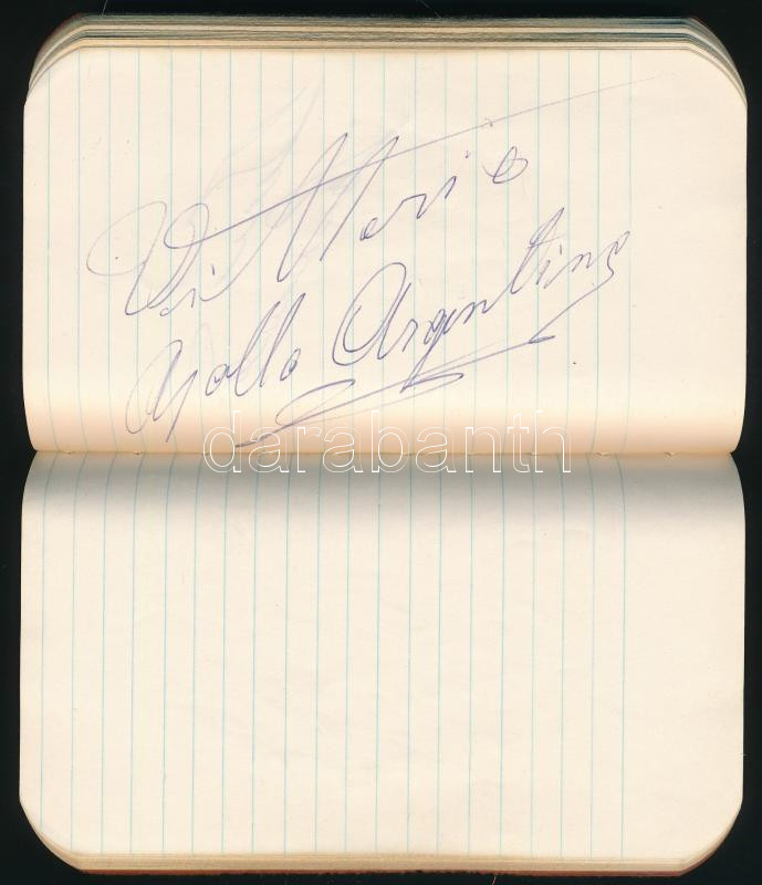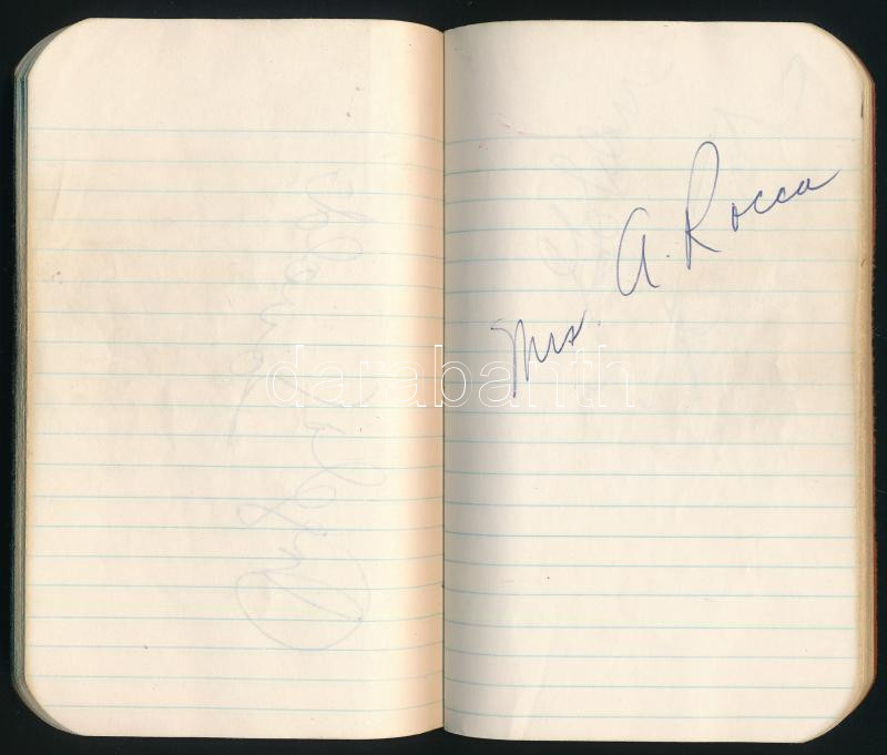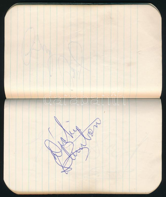 Aláírás-gyűjtemény füzetben, főleg amerikai hírességek (színészek, birkózók, bokszolók): Lionel Hampton (zenész), Ernst Borgnine, Ann Margaret, Jayne Meadows, Louis Nye, Angelo Savoldi, Pedro Morales, Apollo Argentino, Dick Steinborn, stb. (össz. 29 db aláírás) / Notebook with a collection of signatures, mainly American celebrities (actors, wrestlers, boxers): Lionel Hampton (musician), Ernst Borgnine, Ann Margaret, Jayne Meadows, Louis Nye, Angelo Savoldi, Pedro Morales, Apollo Argentino, Dick Steinborn, etc. (29 in total)