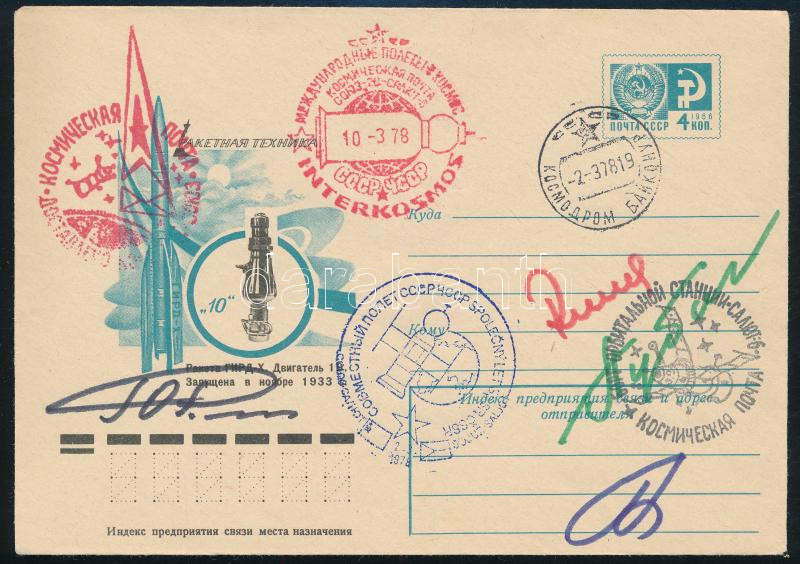 Alekszej Gubarev (1931-2015), Jurij Romanyenko (1944- ), Georgij Grecsko (1931- ) orosz és Vladimír Remek (1948- ) cseh űrhajósok aláírásai emlékborítékon / Signatures of Aleksey Gubarev (1931-2015), Yuriy Romanenko (1944- ), Georgiy Grechko (1931- ) Russian and Vladimír Remek (1948- ) Czech astronauts on envelope