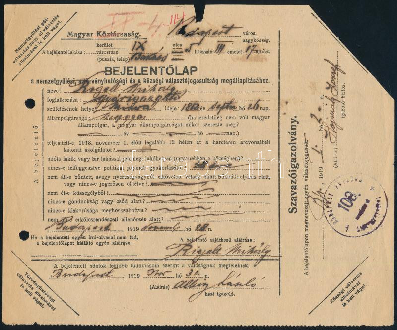 Leírás: 1919 Magyar Köztársaság a nemzetgyűlési, törvényhatósági és a községi választójogosultság bejelentőlap és szavazóigazolvány, Bp., 1919. nov. 30.