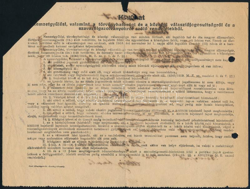 1919 Magyar Köztársaság a nemzetgyűlési, törvényhatósági és a községi ... https://www.darabanth.com/hu/40-Nagyaukcio/40.1/Mutargy-szobor-papirregiseg/Okmanyok~16439/1919-Magyar-Koztarsasag-a-nemzetgyulesi-torvenyhatosagi-es-a-kozsegi-valasztojogosult~II2876096