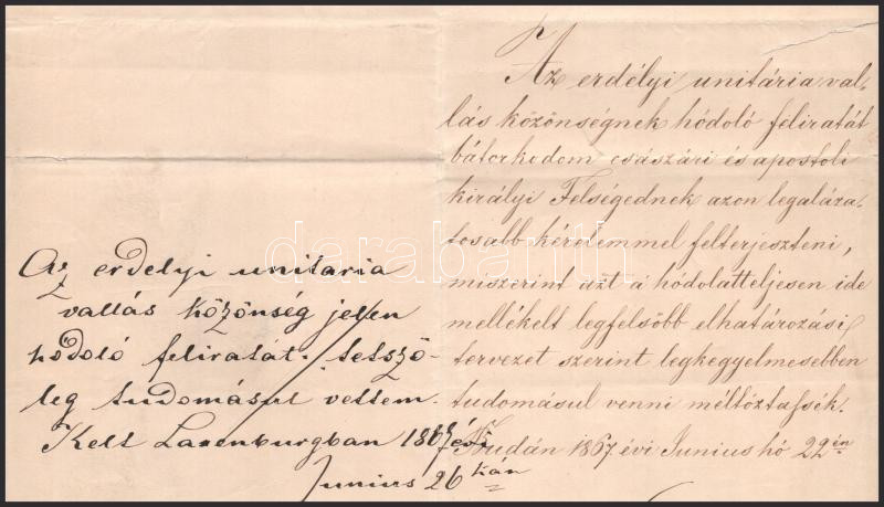 1867 Ferenc József császár és király és Báró Eötvös József (1813-1871) jogász, író, vallás- és közoktatásügyi miniszter, a Magyar Tudományos Akadémia elnöke (1866-1871) autográf aláírással ellátott hivatali okmánya, az erdélyi unitárius egyház feliratának mellékleteként. (a felirat nélkül)