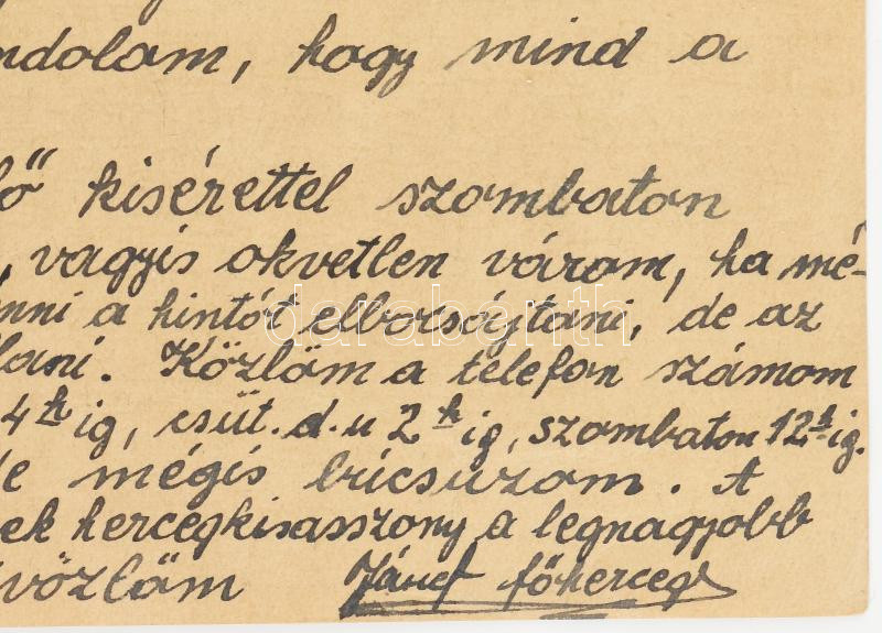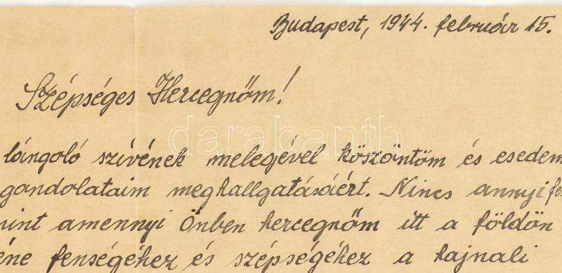 1944 József Ferenc főherceg (1895-1957) saját kézzel írt szerelmes levele, Anna szász királyi főhercegnőnek (1903-1976), melyben meghívja a San Remo-i kastélyában rendezett főnemesi bálra, amelyen a belügyminiszter nem lesz jelen (Keresztes-Fischer Ferenc (1881-1948)), mert visszavonult a táplánypusztai villájába, 1944. feb. 15., 1 beírt oldal., 1 sztl. lev.