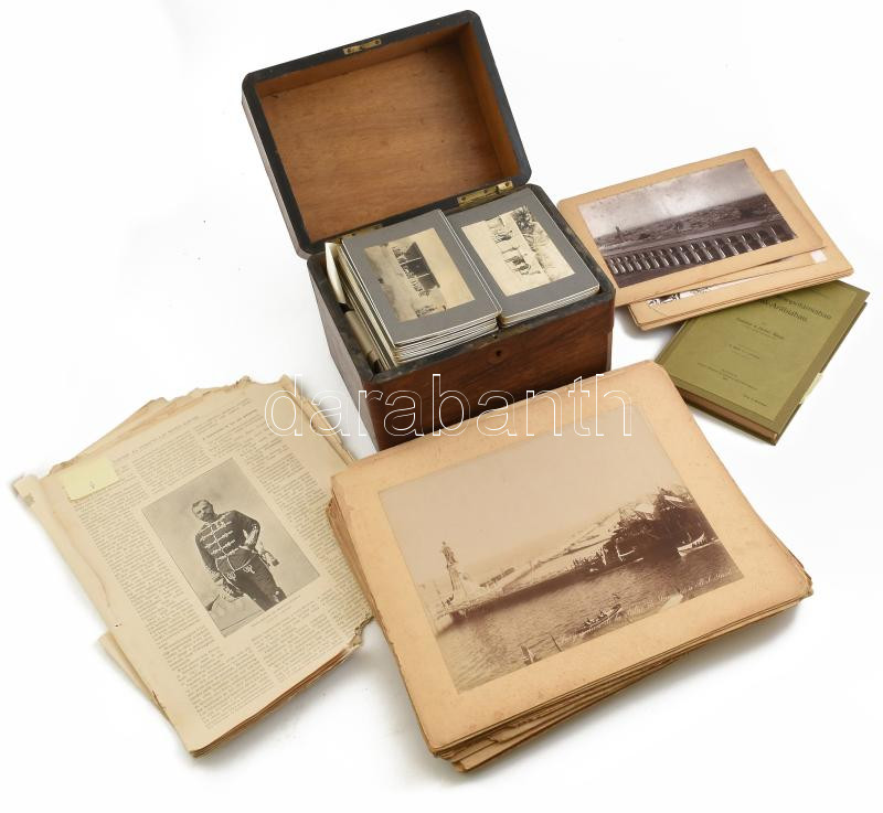 Fadlallah El Hedad Mihály (1841-1924) bábolnai méneskari tábornok, utazó, az Utazásom Mesopotámiában és Irak-Arábiában c. (Bp., 1904. Pallas) útikönyv szerzőjének fotógyűjteménye utazásairól. 233 db a lóvásárló küldöttségek által készített keményhátú fotó hátukon magyar leírással, a fotókon az utazó küldöttség tagjai, az utazás során találkozó személyekkel, életképek, lovak, és nagyon sok látványos érdekesséfg. 17x10 cm méretben, eredeti fa ládikában + 25 db közel-keleti városképes fotó 26x21 cm és 23x28 cm méretben, a megjelent könyv egy példánya, átkötve, az eredeti borítóval, valamint a Vadász és verseny-lap sport albuma c. kiadvány, benne Fadlallah El Hedad Mihály portréjával (megviselt állapotban) Fadlallah El Hedad Mihályt az osztrák birodalom egyik lóvásárló küldöttsége hozta magával árva gyeremekként 1857-ben Magyaországra, ahol katonatisztet neveltek belőle. A lovakat nagyon szerette és értett is hozzájuk, így egész pályafutását a méneskarnál töltötte. Több lóvásárló expedíciót vezetett a Közel-Keletre, valamint Mezopotámiába. Ugyan kikeresztelkedett és katolikus vallású lett, magyarul is megtanult, de arab származását sohasem tagadta meg, és élete végéig megőrizte anyanyelvét. Útleírását a Pallas Kiadó jelentette meg, 1904-ben, Utazásom Mesopotámiában és Irak-Arábiában címmel. Ez egy békés, háborúk nélküli katonai útleírás, amelynek középpontjában az arab lovak, az arab emberek és a táj áll. A fotók némelyike megjelent továbbá a dr. Hecker Walter: A bábolnai arab ménes c. könyvben. Bp., Agronorn. Látványos, fontos anyag!
