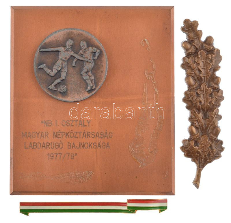 1978. "NB I. osztály - Magyar Népköztársaság Labdarúgó Bajnoksága - 1977/78" bronzozott fém díjplakett zománcozott, bronz és bronzozott díszítményekkel, sérült dísztokban. Az 1977-1978-as szezonban MTK-VM (Vörös Meteor) néven futó klub a 3. helyen végzett az NB I-ben, csak az Újpesti Dózsa és a Budapesti Honvéd előzte meg őket 4, illetve 3 ponttal. Az MTK a Videotont előzte meg 2 ponttal. A keretet akkor olyan játékosok alkották, mint Gáspár József, Egervári Sándor későbbi magyar bajnok edző és szövetségi kapitány, Turtóczky Sándor, Fülöp Ferenc, Brünyi Béla, a vezetőedző pedig Mezey György volt. T:XF a háromból két díszítmény ragasztása elengedett / Hungary 1978. "NB I. osztály - Magyar Népköztársaság Labdarúgó Bajnoksága - 1977/78 (1st League - Hungarian People's Republic - 1977/78" bronzed metal award plaque with enamelled, bronze and bronzed decorations, in a damaged decorative case. In the season 1977-78, the clubs name was MTK-VM (MTK - Red Meteor) and finished in 3rd place in NB I, only Újpesti Dózsa and Budapesti Honvéd were ahead of them with 4 and 3 points, respectively. MTK beat Videoton by 2 points. The team consisted of players such as József Gáspár, Sándor Egervári, later Hungarian champion coach and national team captain, Sándor Turtóczky, Ferenc Fülöp, Béla Brünyi, and the head coach was György Mezey. C:XF the gluing of two of the three decorations was released