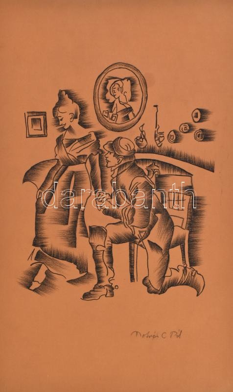 Szén, papír. 50x32cm. https://www.darabanth.com/hu/400-Gyorsarveres/400.0/Festmenyek-es-grafikak/Festmenyek-es-grafikak-jelzessel-jelzes-nelkul~3000002/MCP-jelzessel-Udvarlas-Szen-papir-50x32cm~II2457133