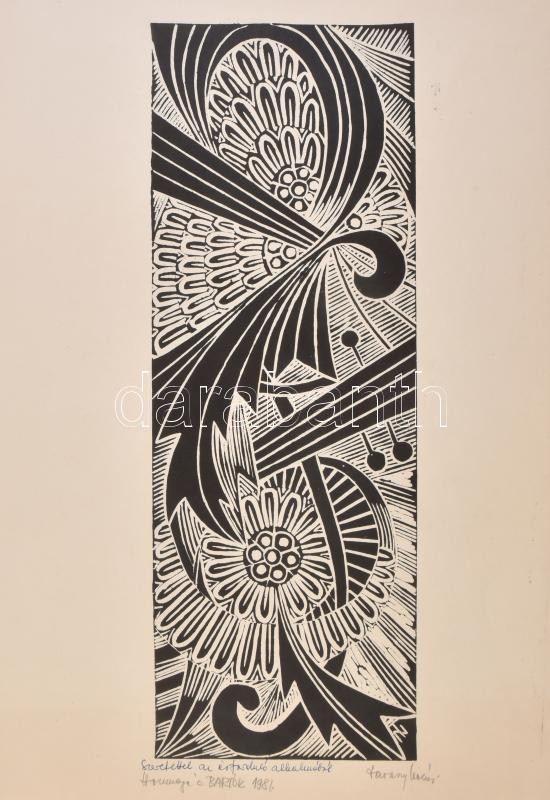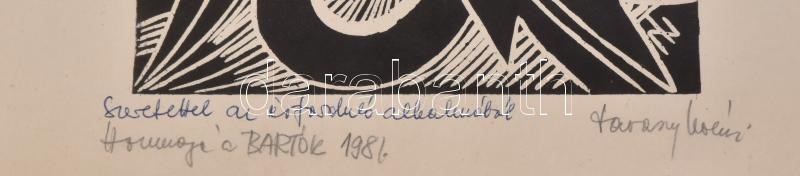 Tavaszy Noémi (1927-2018): Hommage á Bartók, 1981. Linómetszet, papír, jelzett és datált, lap alján autográf felirattal, lap bal oldalán törésnyommal, 38×13,5 cm