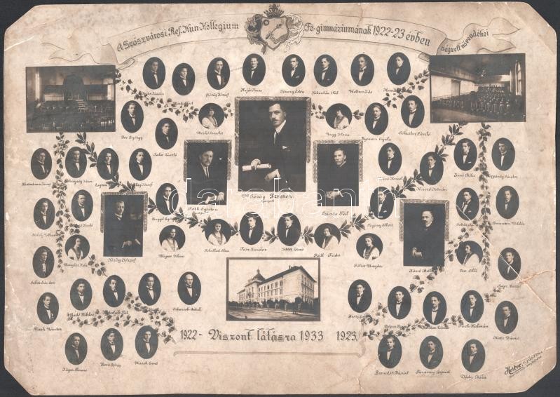 1923 Szászváros, A Szászvárosi Ref. Kun. Kollégium Főgimnáziuma 1923-ben végzett növendékeinek tablófotója, az iskola épületének és két belső termének képeivel, sérült, 25,5×36 cm