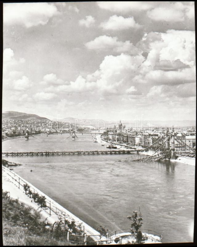 cca 1947 Dunai látkép két ideiglenes híddal, a németek által felrobbantott Erzsébet híd mellett a Böske híd, a távoli háttérben pedig a Kossuth híd látható, 1 db NEGATÍV Fekete György (1904-1990) budapesti fényképész hagyatékából, 6x4,9 cm