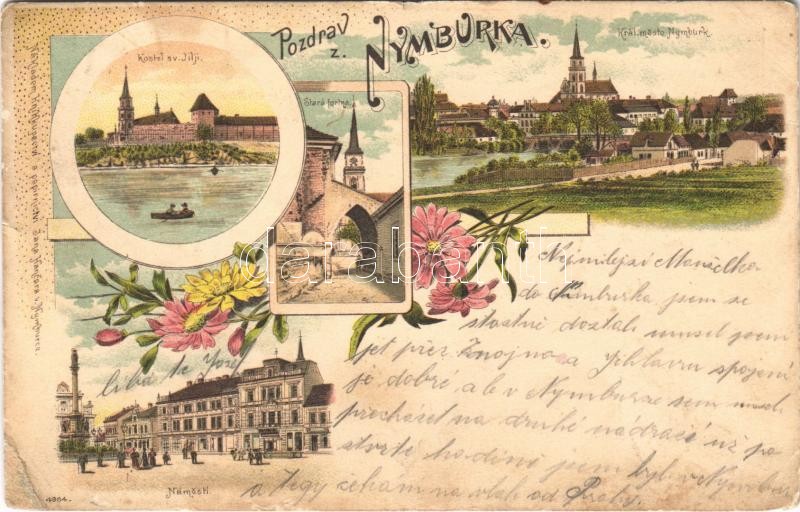 Leírás: 1909 Nymburk, Kostel cv. Julji, Námesti, Stara fortna, Král. mesto / church, old castle gate, square. Jana Hancara Art Nouveau, floral, litho (Rb)