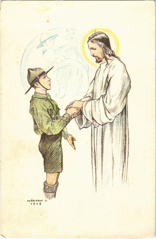 Magyar Cserkész Jézussal / Hungarian scout art postcard s: Márton L. (... https://www.darabanth.com/hu/400-Gyorsarveres/400.0/Kepeslapok/Cserkesz~1000065/Magyar-Cserkesz-Jezussal-Hungarian-scout-art-postcard-s-Marton-L-EK~II2451725