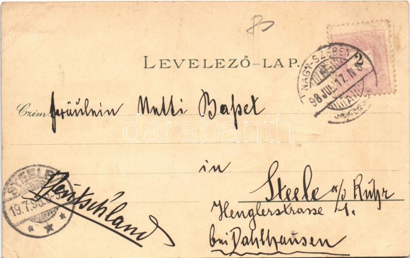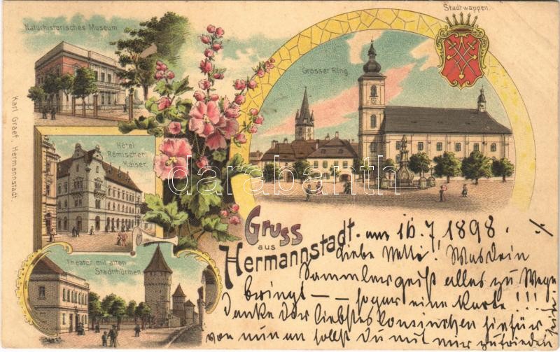 1898 (Vorläufer) Nagyszeben, Hermannstadt, Sibiu; Nagy tér, Természettudományi múzeum, Római császár szálloda, színház, régi várostornyok / Naturhistorisches Museum, Grisser Ring, Hotel Römischer Kaiser,Theater mit alten Stadtthürmen / museum, square, towers, hotel, theatre. Karl Graef Art Nouveau, floral, litho (EK)