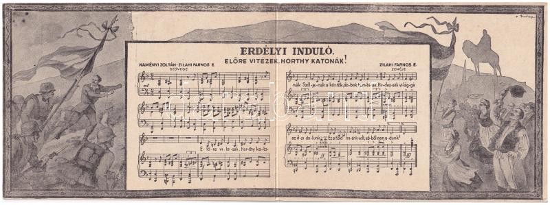 Erdélyi induló. Előre vitézek, Horthy katonák! Zilahi Farnos E. zenéje, Naményi Zoltán-Zilahi Farnos E. szövege. Kiadja a Magyar Nemzeti Szövetség. Kihajtható kottás képeslap / WWII Hungarian army's Transylvanian military anthem, irredenta propaganda, foldable card with sheet music. s: Buday (EK)