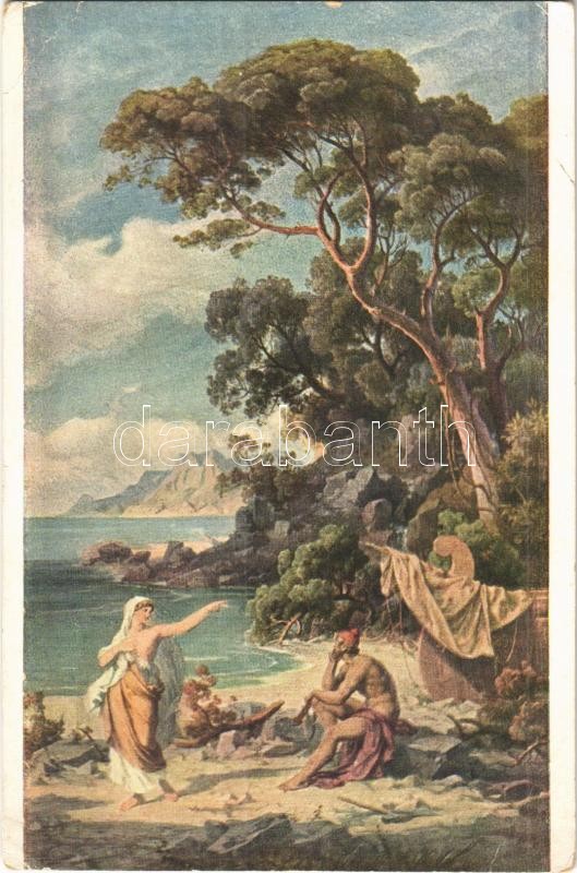 Leírás: Odysseus wird von der Nymphe Kalypso zur Heimat entsandt / Erotic nude lady art postcard s: Fr. Preller (EB)