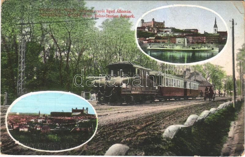 Leírás: Pozsony, Pressburg, Bratislava; Pozsony-Bécs villamos vasút ligeti állomás, gőzmozdony / Pressburg-Wien electr. Bahn-Station Aupark / tramway station, locomotive (EK)