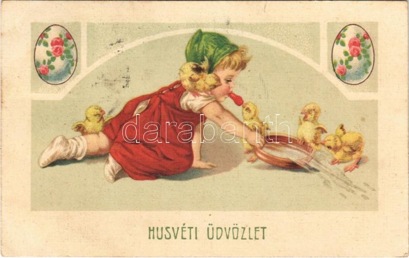 1925 Húsvéti üdvözlet / Children art postcard with Easter greeting, gi... https://www.darabanth.com/hu/400-Gyorsarveres/400.0/Kepeslapok/Gyerek~1000070/1925-Husveti-udvozlet-Children-art-postcard-with-Easter-greeting-girl-with-chicken-and-eggs-~II2445805