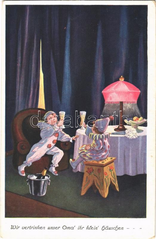 Wir vertrinken unser Oma' für ihr klein' Häuschen / Children... https://www.darabanth.com/hu/400-Gyorsarveres/400.0/Kepeslapok/Gyerek~1000070/Wir-vertrinken-unser-Oma-fur-ihr-klein-Hauschen-Children-art-postcard-clowns-WSSB-9264-EK~II2447557
