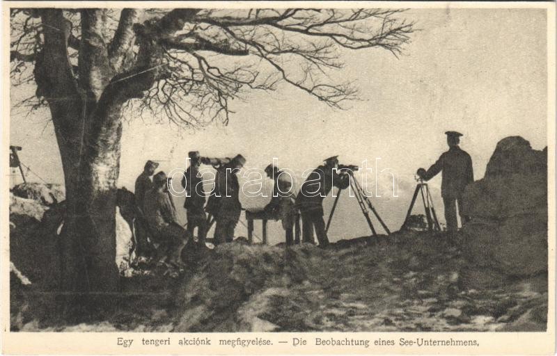 Egy tengeri akciónk megfigyelése. Osztrák-magyar haditengerészet szárazföldi megfigyelői / K.u.K. Kriegsmarine Die Beobachtung eines See-Unternehmens / Austro-Hungarian Navy mariners on mainland (vágott / cut)