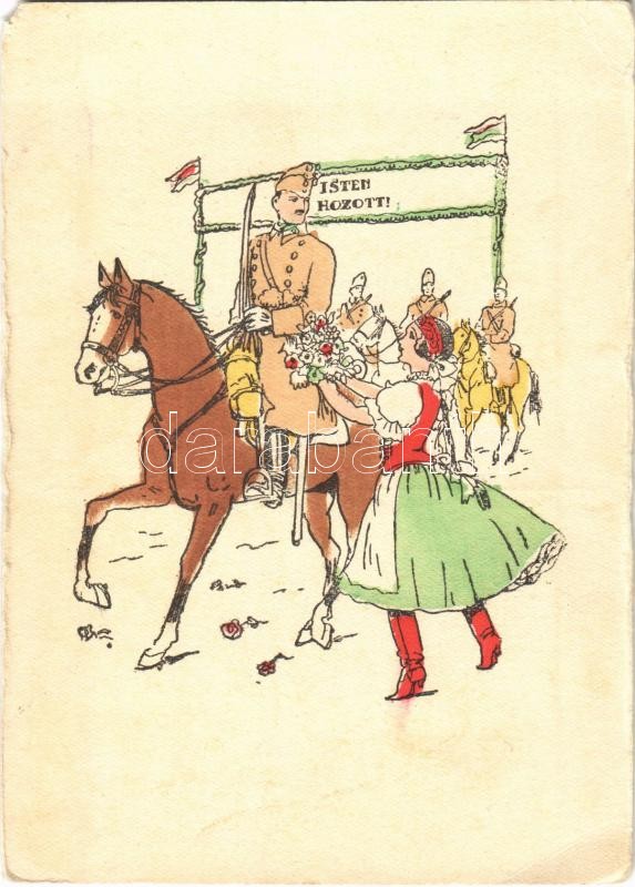 Isten hozott! Bevonulás. Kiadja a Délvidéki Egyetemi és Főiskolai Hallgatók Egyesülete / WWII Hungarian military art postcard, entry of the Hungarian troops, irredenta propaganda (EM)