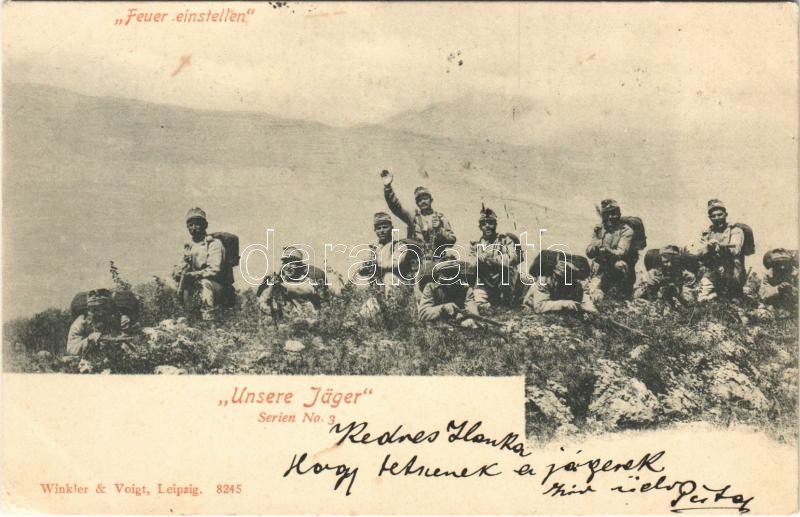 1899 "Feuer einstellen" Unsere Jäger. Serien No. 3. Winkler ... https://www.darabanth.com/hu/400-Gyorsarveres/400.0/Kepeslapok/Katonai~1000080/1899-Feuer-einstellen-Unsere-Jager-Serien-No-3-Winkler-Voigt-Austro-Hungarian-KuK-milit~II2454371