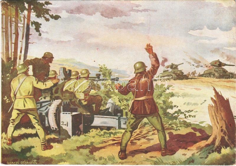 Fazekas Károly őrmester, gépágyús félszakaszparancsnok az Uryw-i harcokban két ellenséges páncélost lőtt ki, több kiserődöt pusztított el és lelőtt egy támadó nehézbombázót / WWII Hungarian military art postcard s: Gönczi Gebhardt (EK)