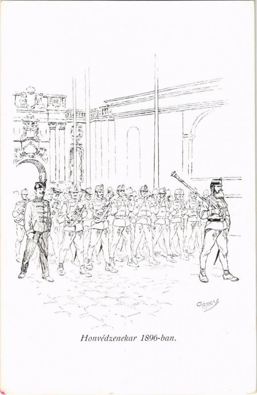 Leírás: Honvéd zenekar 1896-ban. Honvédség története 1868-1918 / Austro-Hungarian K.u.K. military art postcard, military music band in 1896 s: Garay (EK)