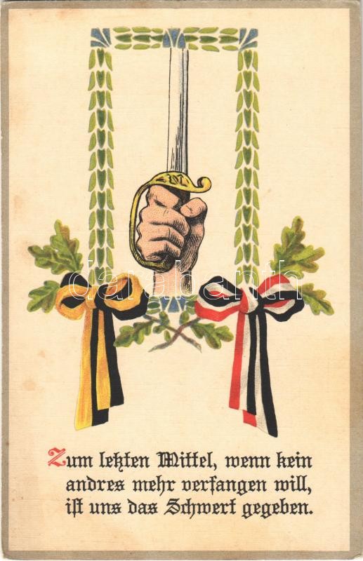 Zum letzten Mittel, wenn kein andres mehr verfangen will ist uns das Schwert gegeben / WWI German and Austro-Hungarian K.u.K. military art postcard, Viribus Unitis, patriotic propaganda with ribbons and sword (fl)