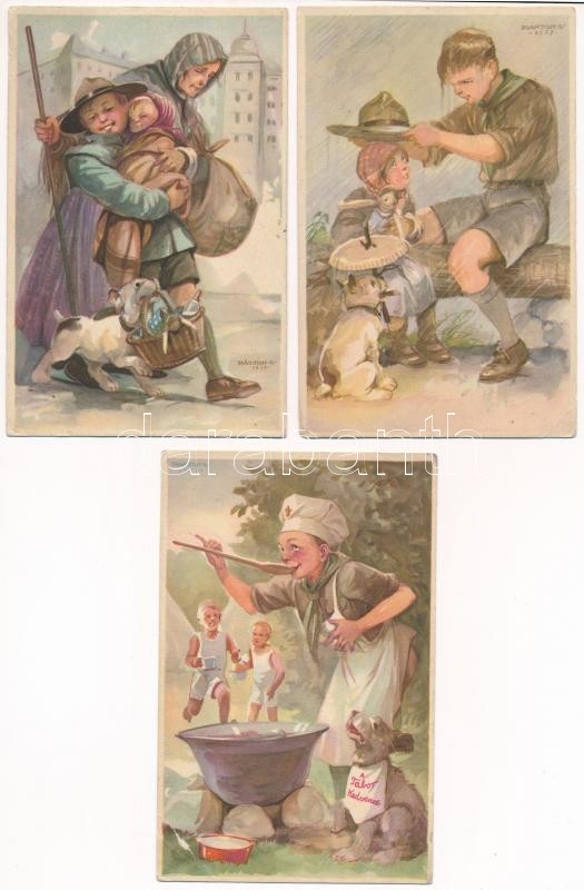 Leírás: 3 db RÉGI Cserkész Levelezőlapok Kiadóhivatal cserkész motívumlap, Márton L. szignóval / 3 pre-1945 Hungarian scout art postcards, signed by Márton L.
