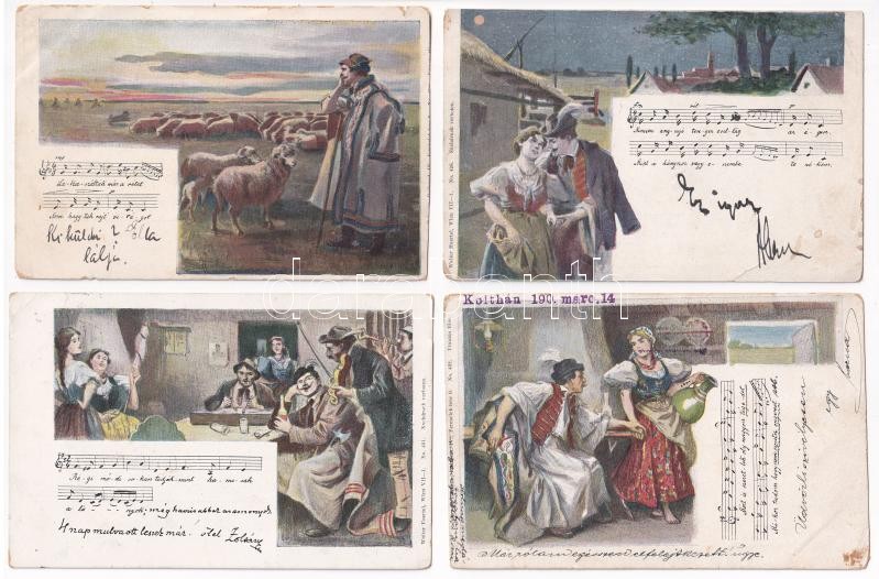 Leírás: 4 db RÉGI hosszú címzéses motívum képeslap: folklór kottás / 4 pre-1905 motive postcards: folklore music sheet