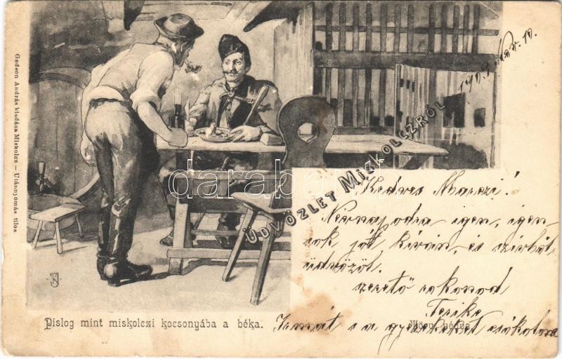Leírás: 1903 Miskolc, Pislog, mint miskolczi kocsonyában a béka. Kiadja Gedeon A. humoros, folklór művészlap (EK)