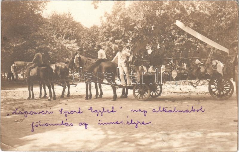Leírás: 1921 Nagyatád, Kaposvári Ipart. Egylet nap alkalmából fölvonulás az ünnepélyre, feldíszített lovaskocsi. photo (EK)