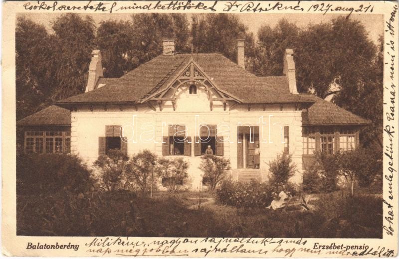 1927 Balatonberény, Erzsébet pensio (EK) https://www.darabanth.com/hu/400-Gyorsarveres/400.0/Kepeslapok/Magyarorszag~1000006/1927-Balatonbereny-Erzsebet-pensio-EK~II2449442