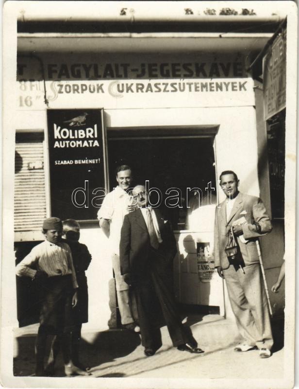 Leírás: 1935 Siófok, Kolibri Automata szabad bejárat, fagylalt, jegeskávé, szörpök és cukrászsütemények, üzlet. photo (non PC) (11,5 x 8,7 cm)