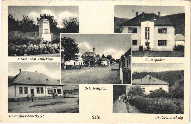 Leírás: 1950 Szin (Borsod), földmívesszövetkezet, községháza, erdőgondnokság, református templom, orosz hősi emlékmű. Özv. Horváth Richárdné kiadása (EK)