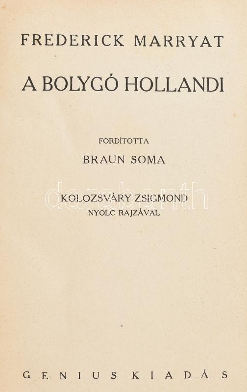 Marryat, Frederick: A bolygó hollandi. Ford.: Braun Soma. Kolozsváry Zsigmond (1899-1983) nyolc rajzával. Bp., é.n., Genius. 360 p + 8 t. Egészoldalas fekete-fehér illusztrációkkal. Könyvkötői aranyozott félvászon-kötés, kissé kopott és sérült borítóval.
