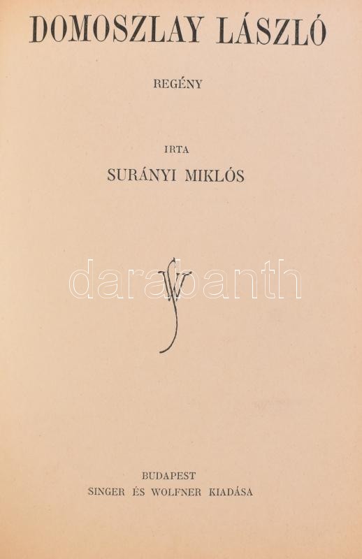 Surányi Miklós: Domoszlay László. Bp., 1921, Singer és Wolfner. 275 p. Első kiadás. Sérült, átkötött, aranyozott félbőr-kötés, hiányos, javított gerinccel, kopott borítóval, részben aranyozott lapélekkel. A szerző által DEDIKÁLT, sorszámozott (65./100) példány.