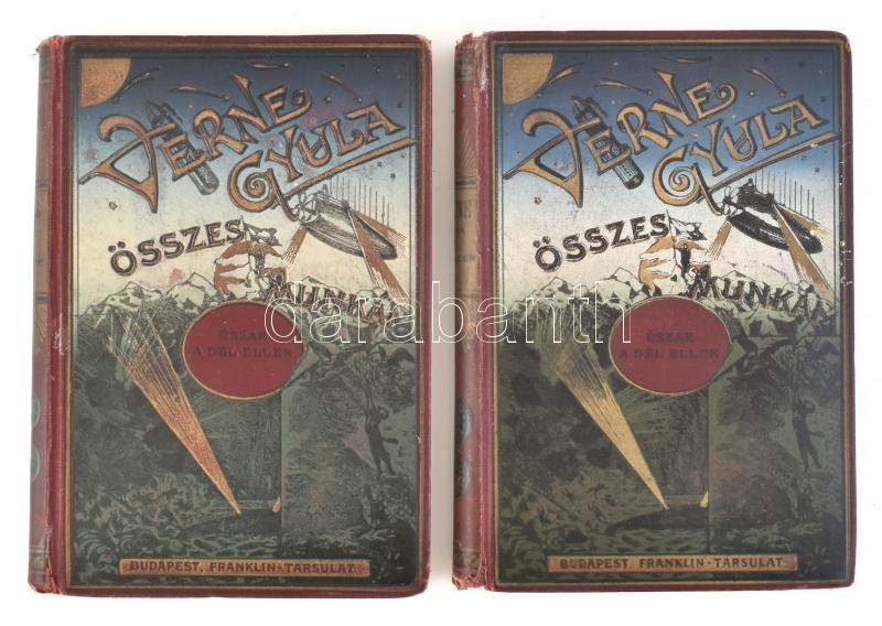 Leírás: Verne Gyula: Észak a Dél ellen. I-II. kötet. Ford.: Huszár Imre. Bp., [1925], Franklin-Társulat. 384 p. Fekete-fehér képekkel illusztrálva. Kiadói aranyozott, festett, illusztrált egészvászon-kötés, kopott, kissé sérült borítóval, a címlapokon tulajdonosi bejegyzéssel.
