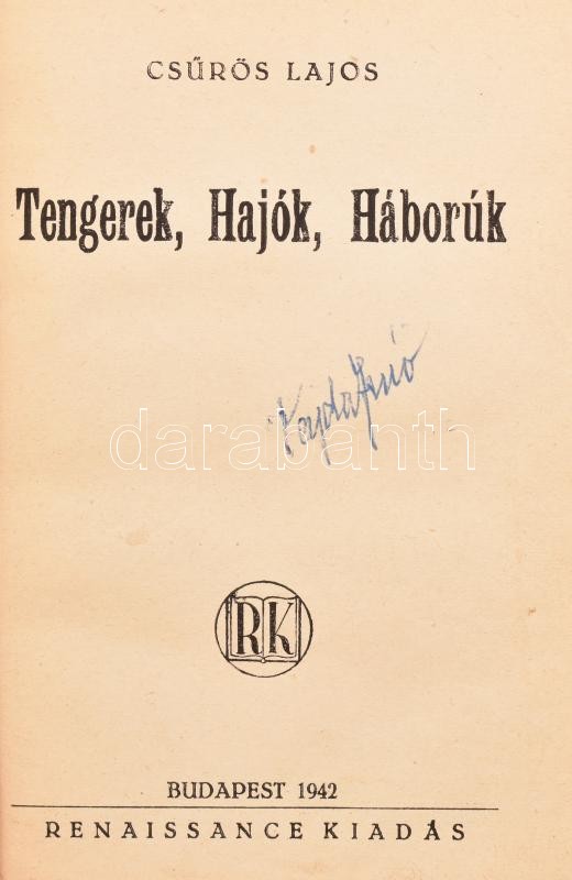 Csűrös Lajos: Tengerek, hajók, háborúk. Bp., 1942., Renaissance, 197+3... https://www.darabanth.com/hu/400-Gyorsarveres/400.0/Konyvek/Konyvek-Epiteszet-muveszet~1500007/Csuros-Lajos-Tengerek-hajok-haboruk-Bp-1942-Renaissance-197plus3-pplus8-t-Fekete-feher-fo~II2429065
