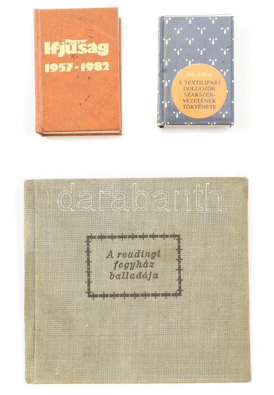 3 db minikönyv - Réti László: A textilipari dolgozók szakszervezetének története. + Magyar Ifjúság 1957-1982. + A readingi fegyház balladája. Kötetenként változó kötésben és állapotban.