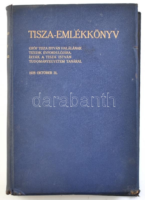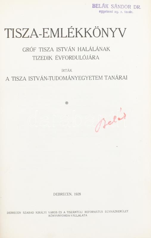 Tisza-emlékkönyv. Gróf Tisza István halálának tizedik évfordulójára írták a Tisza István-Tudományegyetem tanárai. Debrecen, 1928., Debrecen Szabad Királyi Város-Tiszántúli Református Egyházkerület Könyvnyomda-Vállalata, 1 (címkép, Tisza István portréja) t.+2+296 p.+ 1 (fekete-fehér fotó, Tisza István debreceni jogász korában) + 2 (kézirat hasonmások) t. Kiadói aranyozott egészvászon-kötés, márványozott lapélekkel, kissé kopott, kissé foltos borítóval, a gerincen kis sérüléssel. Belák Sándor (1886-1947) enyingi születésű kísérleti kórtani kutató, farmakológus, MTA levelező tag, egyetemi tanár névbélyegzőjével és névbejegyzésével.