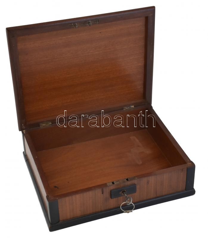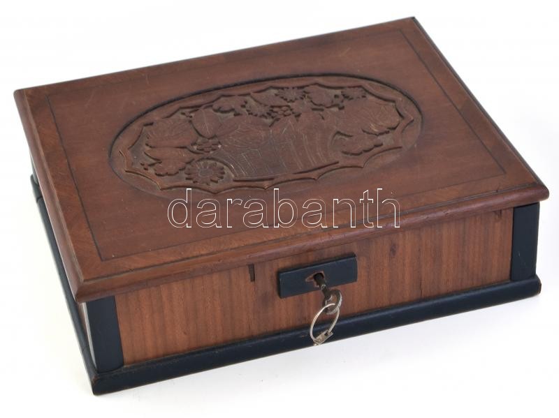 Leírás: Faragott fa doboz. Kulccsal. Kopott, apró sérülések. 31x25x9cm