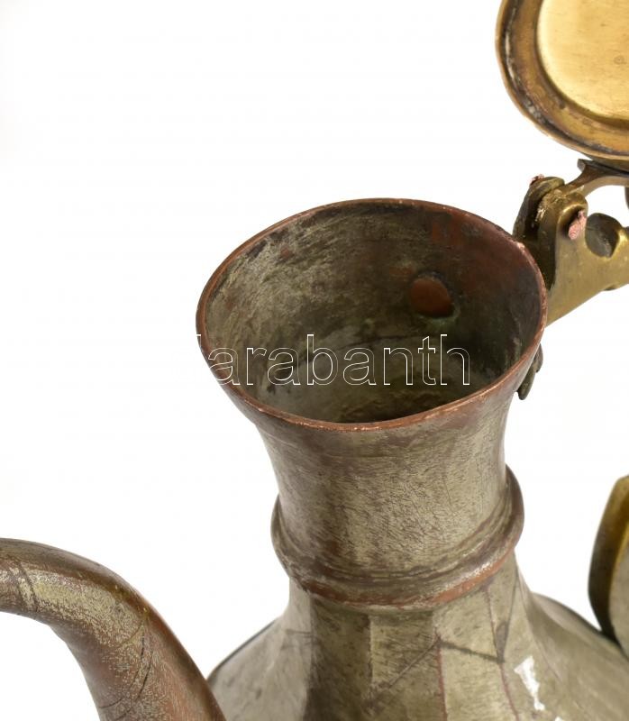 Leírás: Régi török réz kanna, kopásnyomokkal (pótolt fedéllel?), m: 38,5 cm