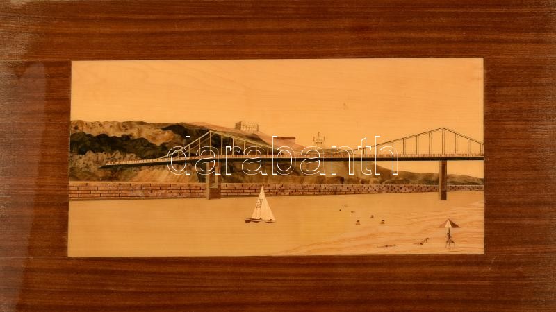 Leírás: Vitorlás a Dnyepr folyón Kijevnél, retro szovjet intarziás fa falikép, hátoldalán címkén feliratozott, oldalán sérült, 30×48 cm