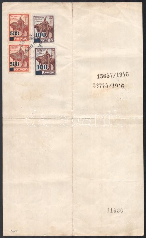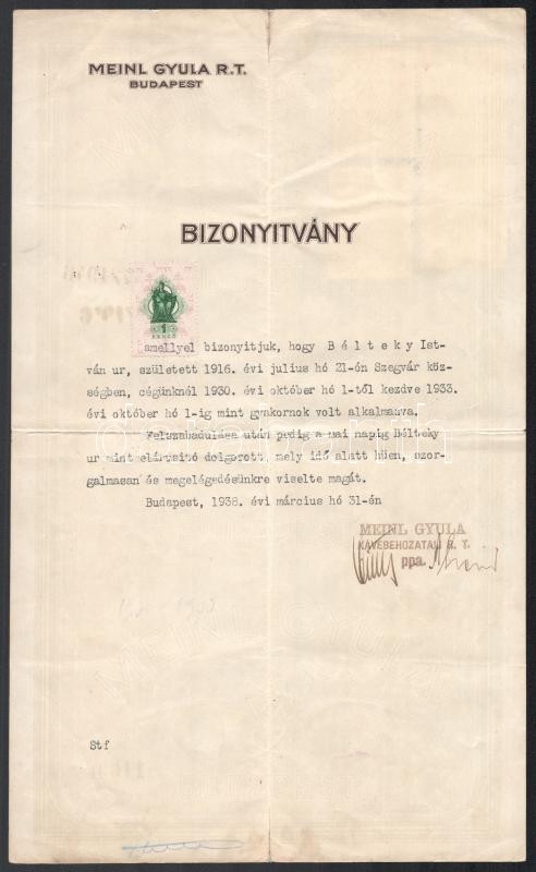 Leírás: 1938 A Meinl Gyula Rt. által Bélteky István elárusítója részére kiadott bizonyítvány felülnyomott Budapest Székesfőváros illetékbélyegekkel