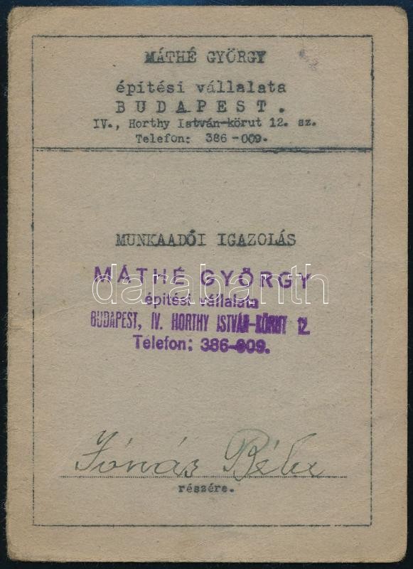 1944 Bp., Máthé György építési vállalata fényképes igazolvány https://www.darabanth.com/hu/400-Gyorsarveres/400.0/Mutargy-papirregiseg-egyeb/Okmanyok~500016/1944-Bp-Mathe-Gyorgy-epitesi-vallalata-fenykepes-igazolvany~II2454947