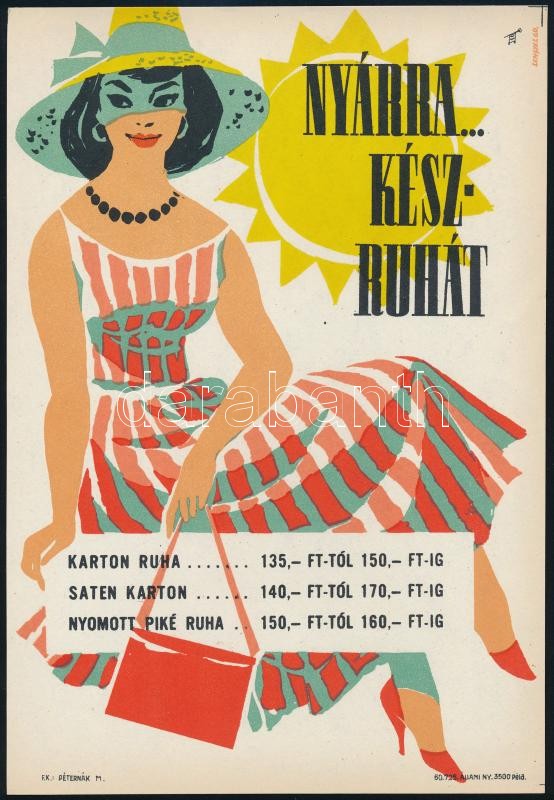 1960 Villamosplakát: Nyárra ... készruhát, gr: Lengyel, 23,5×16,5 cm https://www.darabanth.com/hu/400-Gyorsarveres/400.0/Mutargy-papirregiseg-egyeb/Plakat~500035/1960-Villamosplakat-Nyarra-keszruhat-gr-Lengyel-23-5C39716-5-cm~II2454381