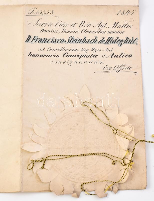 1845 Udvari titkári kinevezés hidegkúti Steinbach Ferenc részére, Pesthidegkút kegyura részére, Gróf nagyapponyi Apponyi György (1808-1899) főkancellár aláírásával Kézzel írt, rajzolt oklevél uralkodói papírfelzetes viaszpecséttel