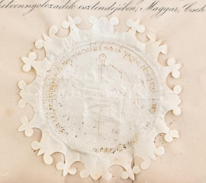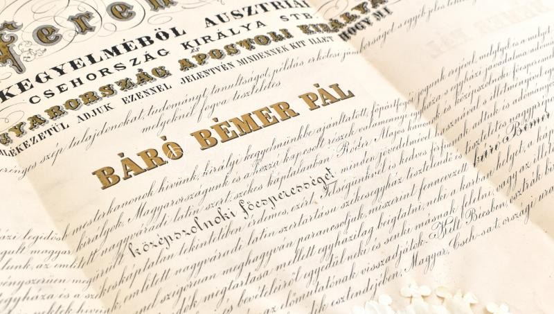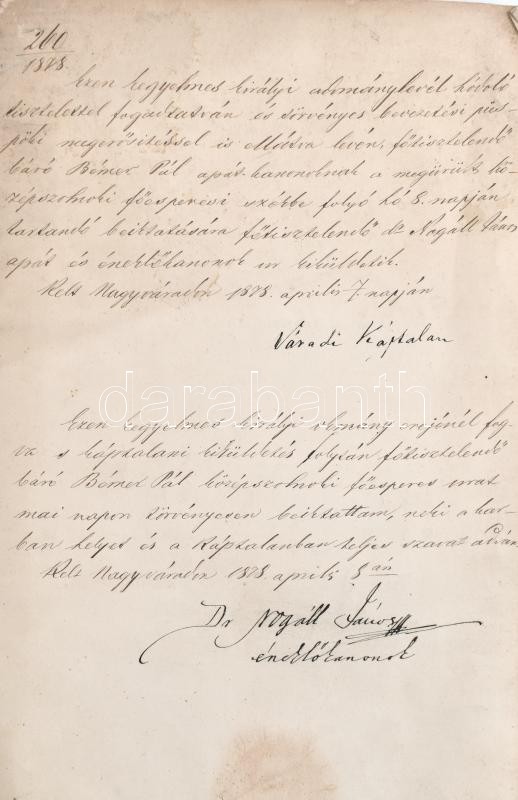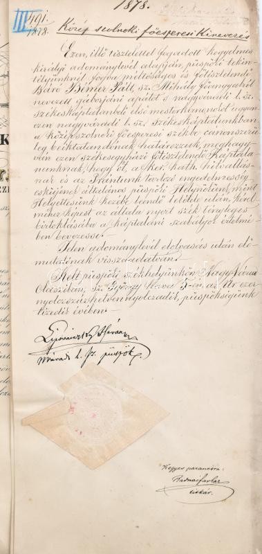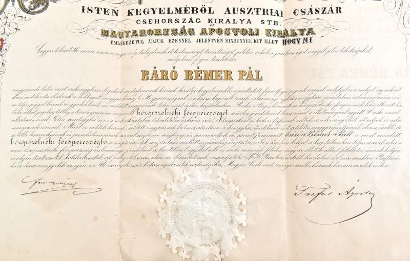 1878 Középszolnoki (Erdély) főesperesi kinevezés báró Bémer Pál részére Ferencz József király és Trefort Ágoston vallás és közoktatásügyi miniszter autográf aláírásával és a nagyváradi püspök ellenjegyzésével kis beszakadásokkal. Kézzel festett oklevél / 1878 Chief dean to a Transylvanian county appointing warrant with autograph signature of Emperor Franz Joseph. countersigned by the bishop of Nagyvárad 57x41 cm