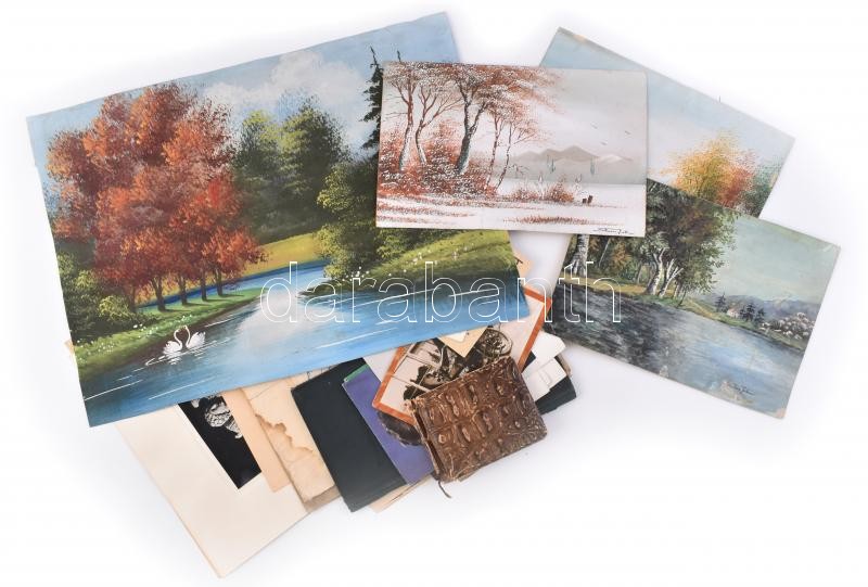Vegyes papírrégiség tétel, közte 4 db akvarell, W. J. Loftie, Lessons in the art of Illuminatic, okmányok, egyházi papírok, ismert embereket ábrázoló nyomtatványok...stb. Változó állapotban. Különféle méretben.